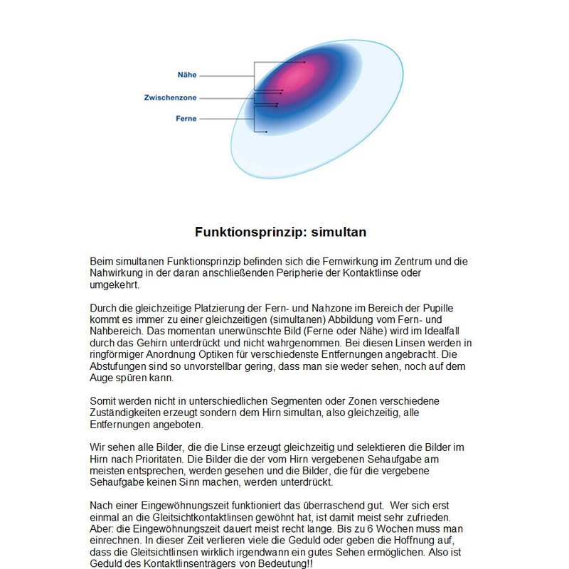 Funktionsprinzip: simultan Beim simultanen Funktionsprinzip befinden sich die Fernwirkung im Zentrum und die Nahwirkung in der daran anschließenden Peripherie der Kontaktlinse oder umgekehrt.