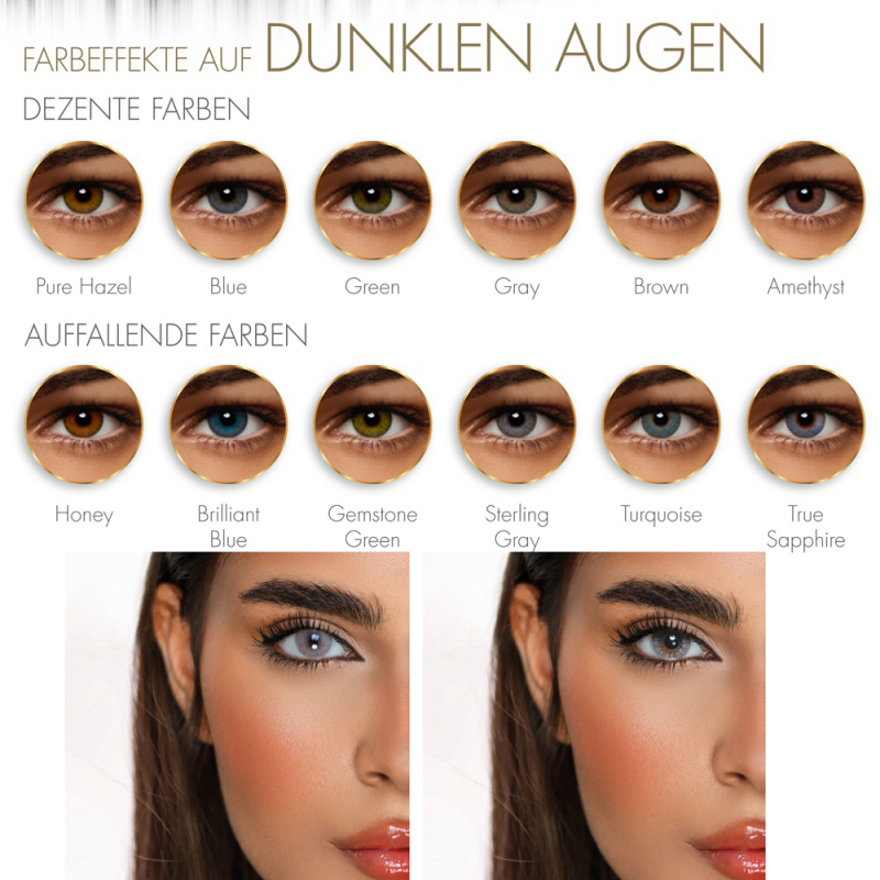Wassergehalt: 33 % Durchmesser: 14,2 mm Basiskurve: 8,6 mm Stärke: -8,00 bis +6,00 dpt Farben: Pure Hazel, Honey, Green, Gemstone Green, Blue, Brilliant Blue, Gray, Sterling Gray, Brown, Turquoise, Amethyst