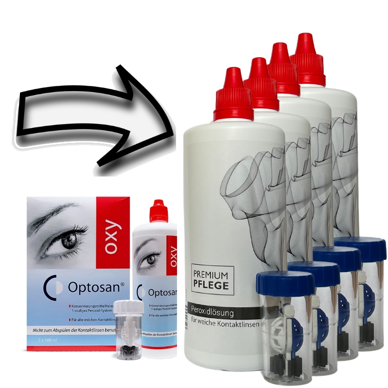 Optosan Oxy ist ein wirkungsvolles Peroxid Pflegesystem von Cooper. Mit einer beeindruckenden Dreifachwirkung werden rigoros alle Ablagerungen, Keime und Krankheitserreger von den Kontaktlinsen entfernt. Das Pflegesystem Optosan Oxy mit Peroxid kann bei weichen Kontaktlinsen als auch bei harten Linsen zur Reinigung verwendet werden. Mit der Optosan Oxy Lösung werden mit der Tiefenreinigung die Kontaktlinsen sicher desinfiziert und von Lipiden und Fetten befreit. Die Zusammensetzung der Optosan Oxy Peroxidlösung ist sanft zu den Augen und kann auch bei empfindlichen Augen eingesetzt werden.