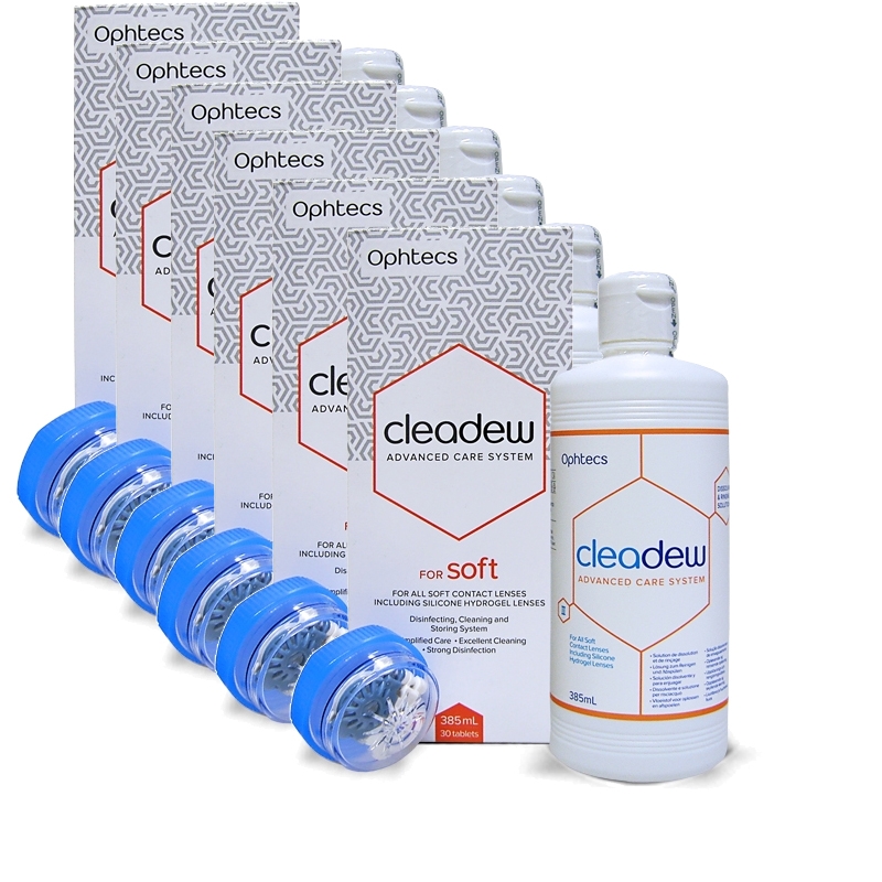 Packungsinhalt: 6 x 385ml Cleadew for Soft, 6 x 30 Tabletten und 6 x 1 Behälter für alle weichen Linsen.