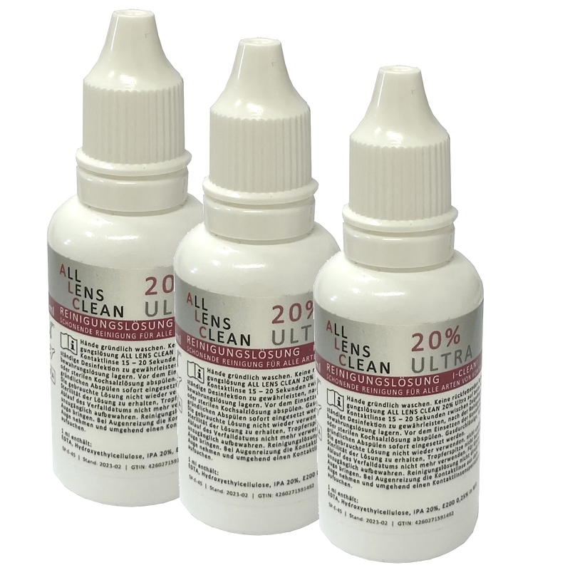 All Lens Clean 20% Ultra ist ein nicht-abrasiver Alkohol-Tensid-Reiniger zur effizienten Entfernung von Glycoproteinen und Fettdepots bei allen Arten von Kontaktlinsen.