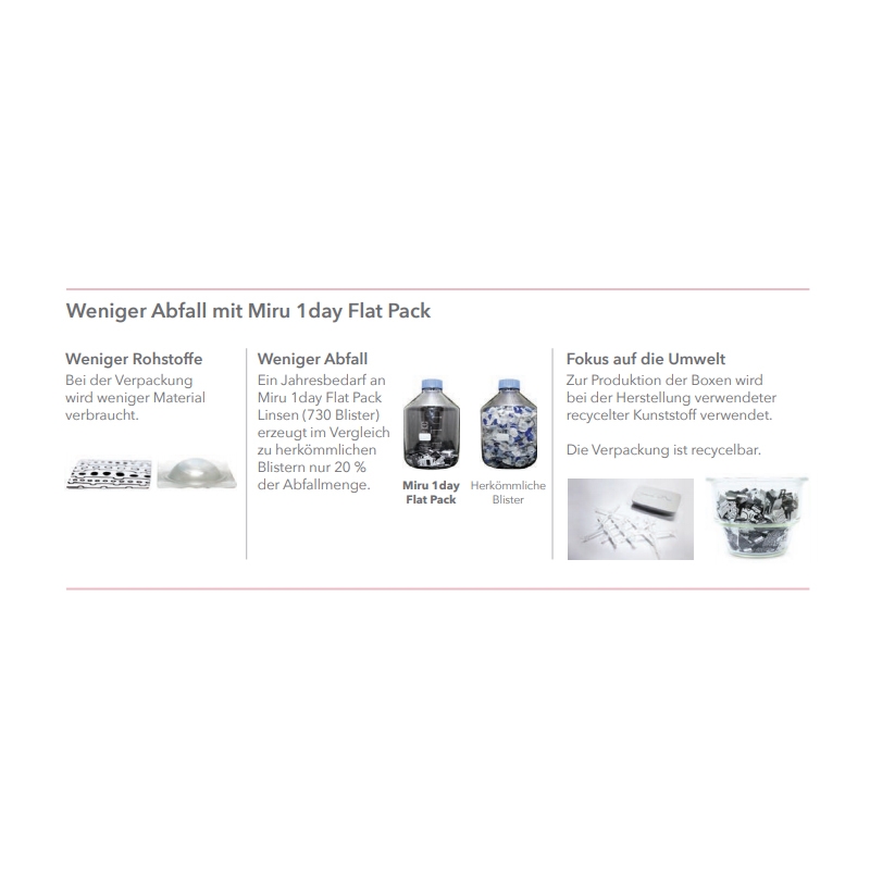 MIRU stehen für beeindruckenden Komfort, einfaches Handling und überzeugen in jeder Hinsicht. Miru 1Day Flat Pack Toric sind torische Tageslinsen, die alle Vorzüge der MIRU Linsen vorweisen können. Angefangen mit dem intelligenten Verpackungsdesign, welches einmalig unter den Kontaktlinsen Blistern ist. Ultra dünn und einfach in der Handhabung. Die torischen MIRU Tageslinsen sind in dem Blister so gelagert, dass kein Verrutschen möglich ist und immer die richtige Seite nach oben liegt. Daran schliesst sich eine hygienische Entnahme aus dem Blister an.