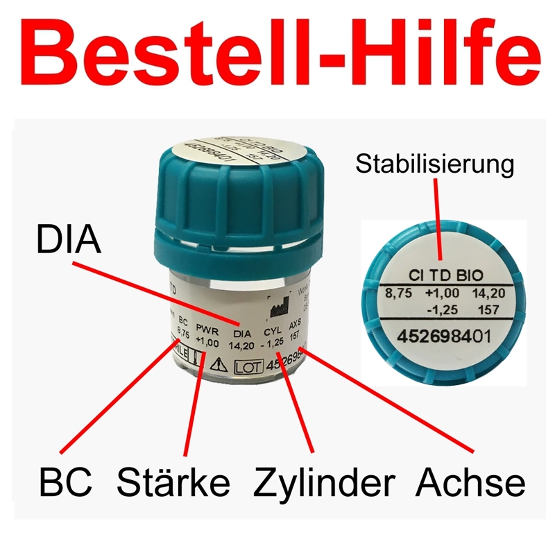 Um die Linse auf dem Auge stabil in Ihrer Achslage zu halten, werden, in Abhängigkeit von der Hornhautform, 3 unterschiedliche Rückflächenformen angeboten: TD = Torisch-Dynamisch TDS = Torisch-Dynamisch-Symmetrisch TP = Torisch-Prismatisch ( bei Bestellung Prisma angeben: 1.50 pdpt oder 2.00 pdpt )